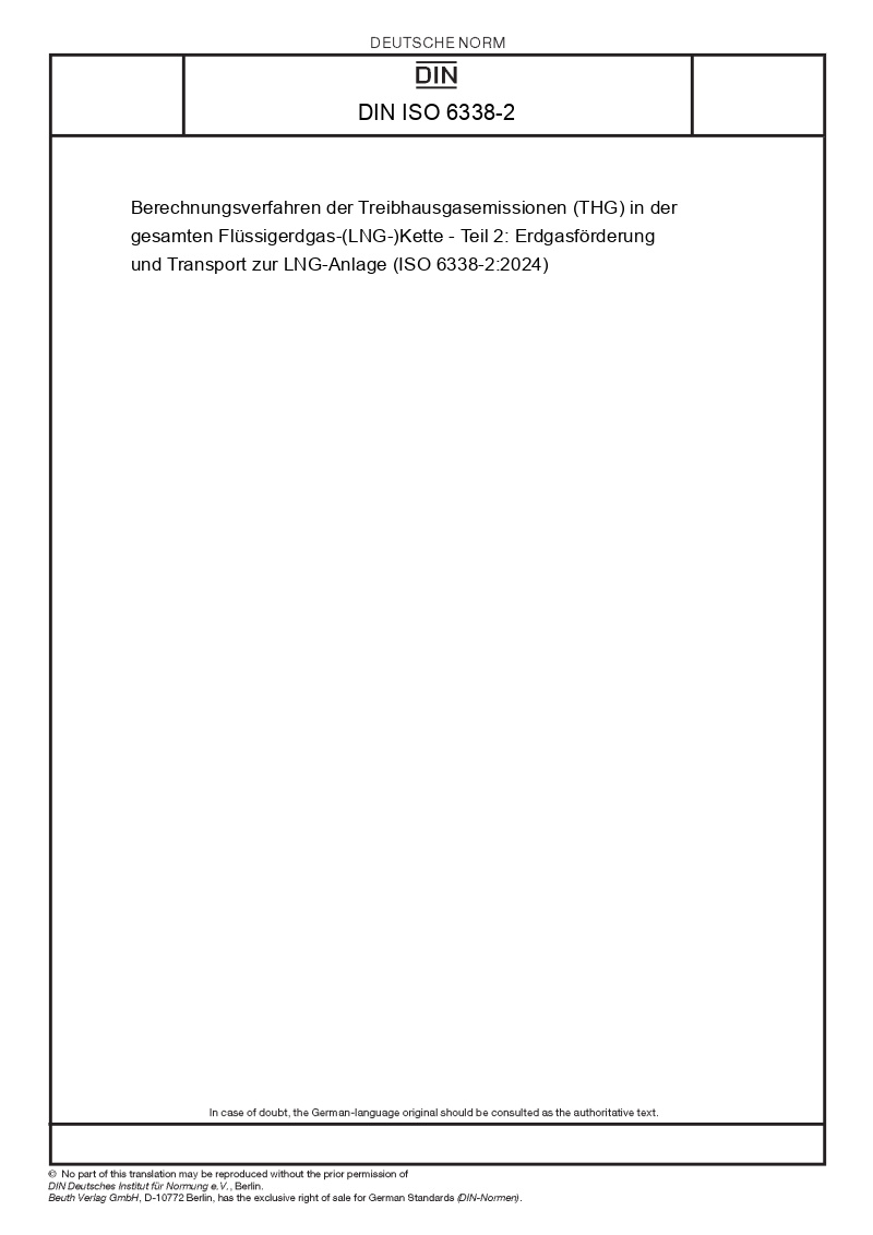>DIN Standards>DIN ISO 6338-2 Berechnungsverfahren der Treibhausgasemissionen (THG) in der gesamten Flüssigerdgas-(LNG-)Kette - Teil 2: Erdgasförderung und Transport zur LNG-Anlage (ISO 6338-2:2024)