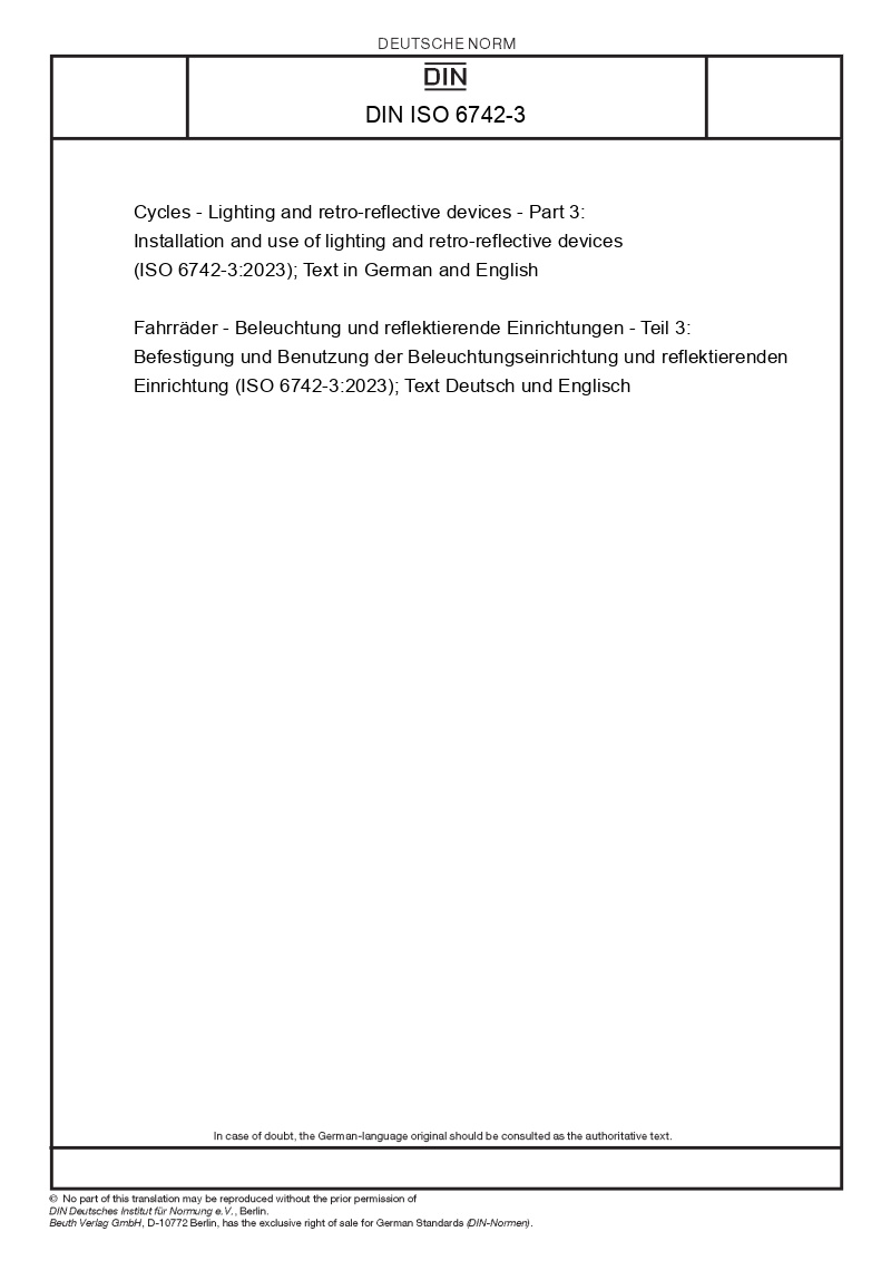 Name: | Cycles - Lighting and retro-reflective devices - Part 3: Installation and use of lighting and retro-reflective devices (ISO 6742-3:2023); Text in German and English |