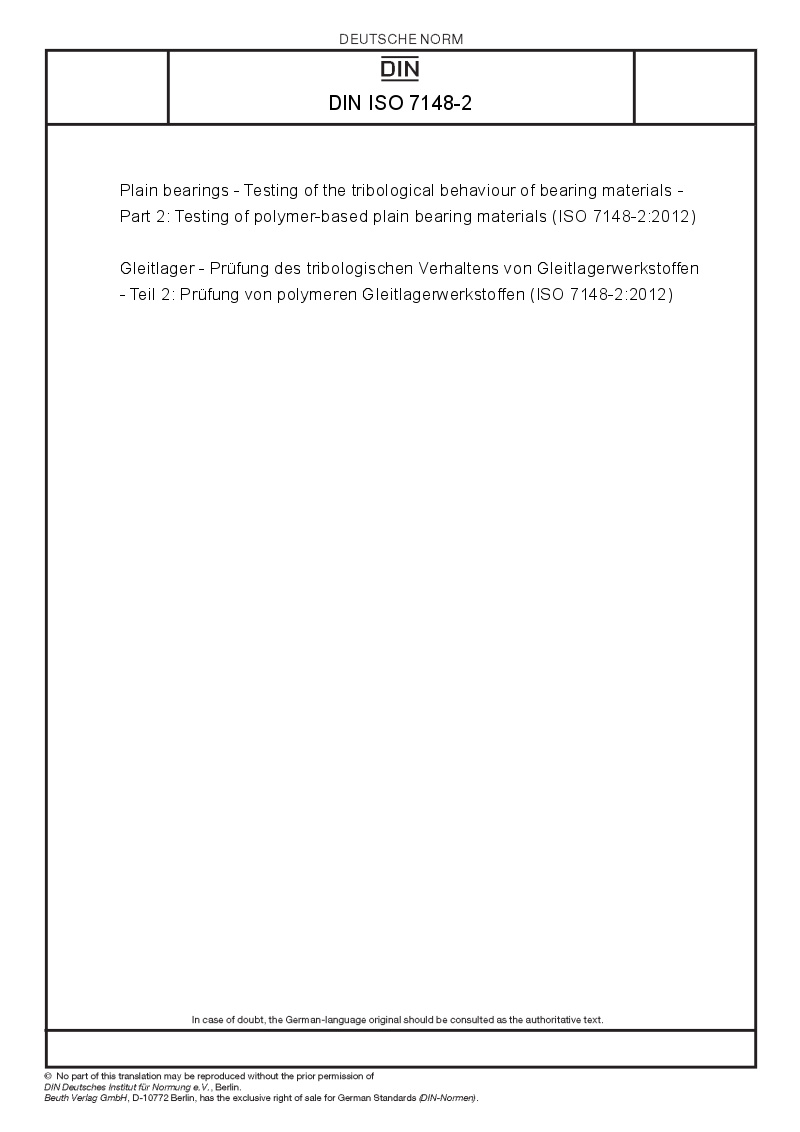 Gleitlager - Prüfung des tribologischen Verhaltens von Gleitlagerwerkstoffen - Teil 2: Prüfung von polymeren Gleitlagerwerkstoffen (ISO 7148-2:2012)