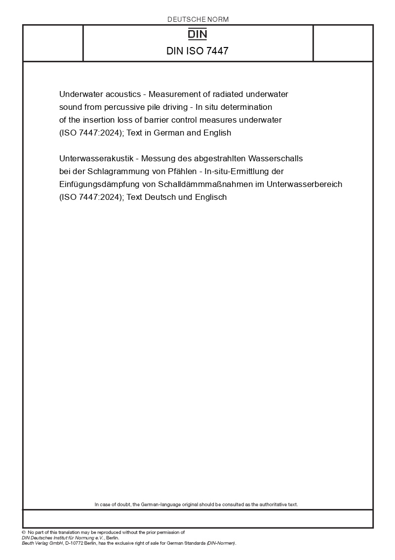 | Name: | Underwater acoustics - Measurement of radiated underwater sound from percussive pile driving - In situ determination of the insertion loss of barrier control measures underwater (ISO 7447:2024); Text in German and English |