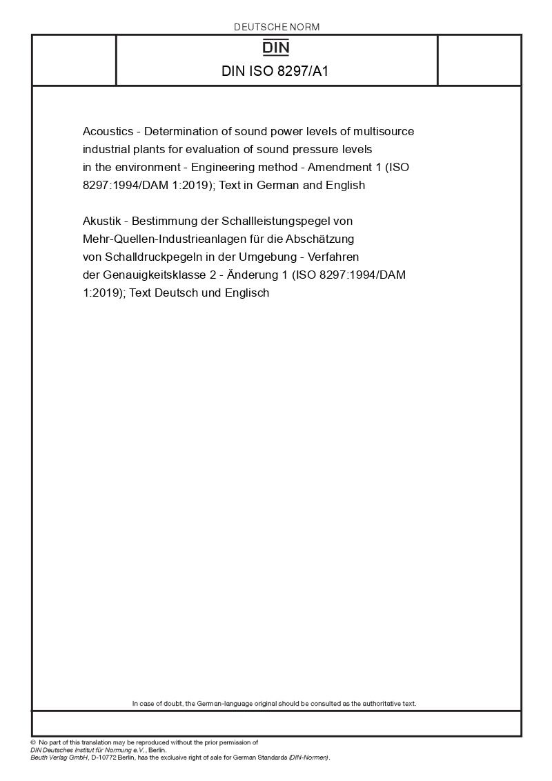 | Name: | Acoustics - Determination of sound power levels of multisource industrial plants for evaluation of sound pressure levels in the environment - Engineering method - Amendment 1 (ISO 8297:1994/DAM 1:2019); Text in German and English |