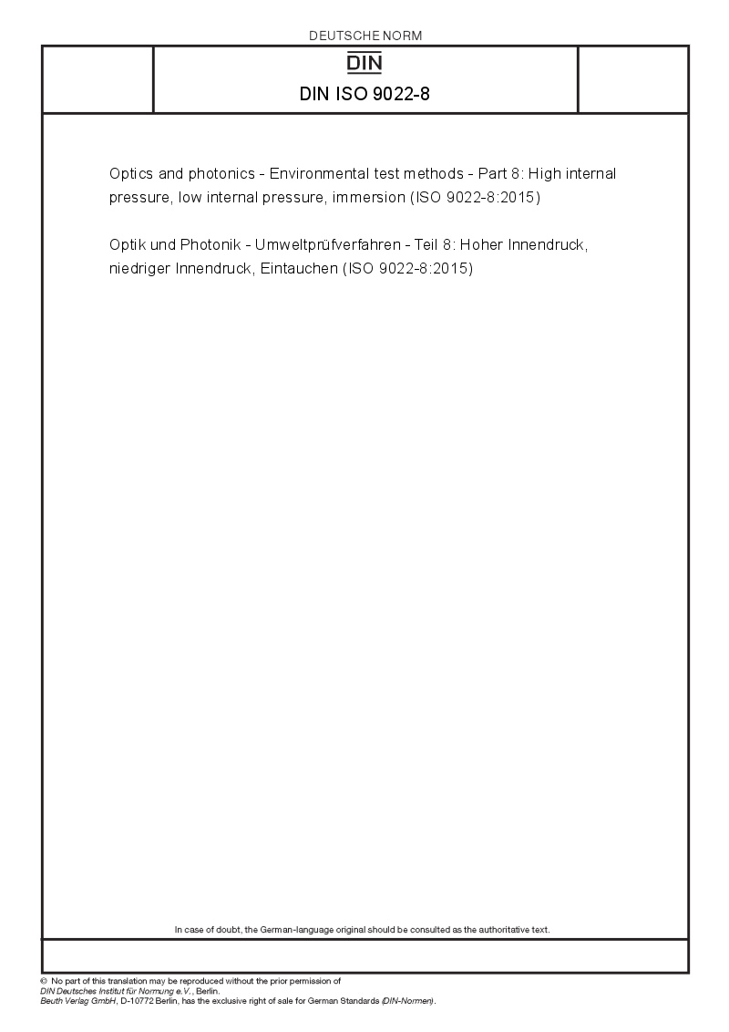 Optik und Photonik - Umweltprüfverfahren - Teil 8: Hoher Innendruck, niedriger Innendruck, Eintauchen (ISO 9022-8:2015)