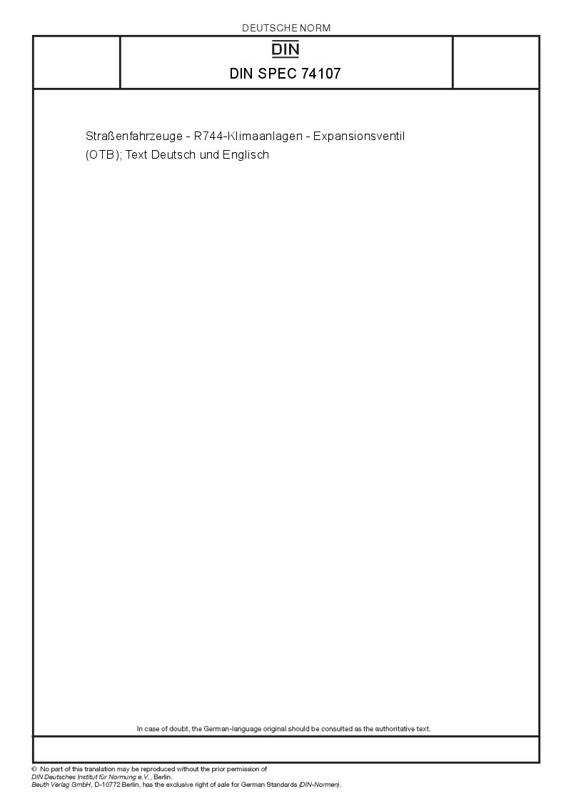 DIN SPEC 74107 Straßenfahrzeuge - R744-Klimaanlagen - Expansionsventil (OTB); Text Deutsch und EnglischNot available online - contact us!
