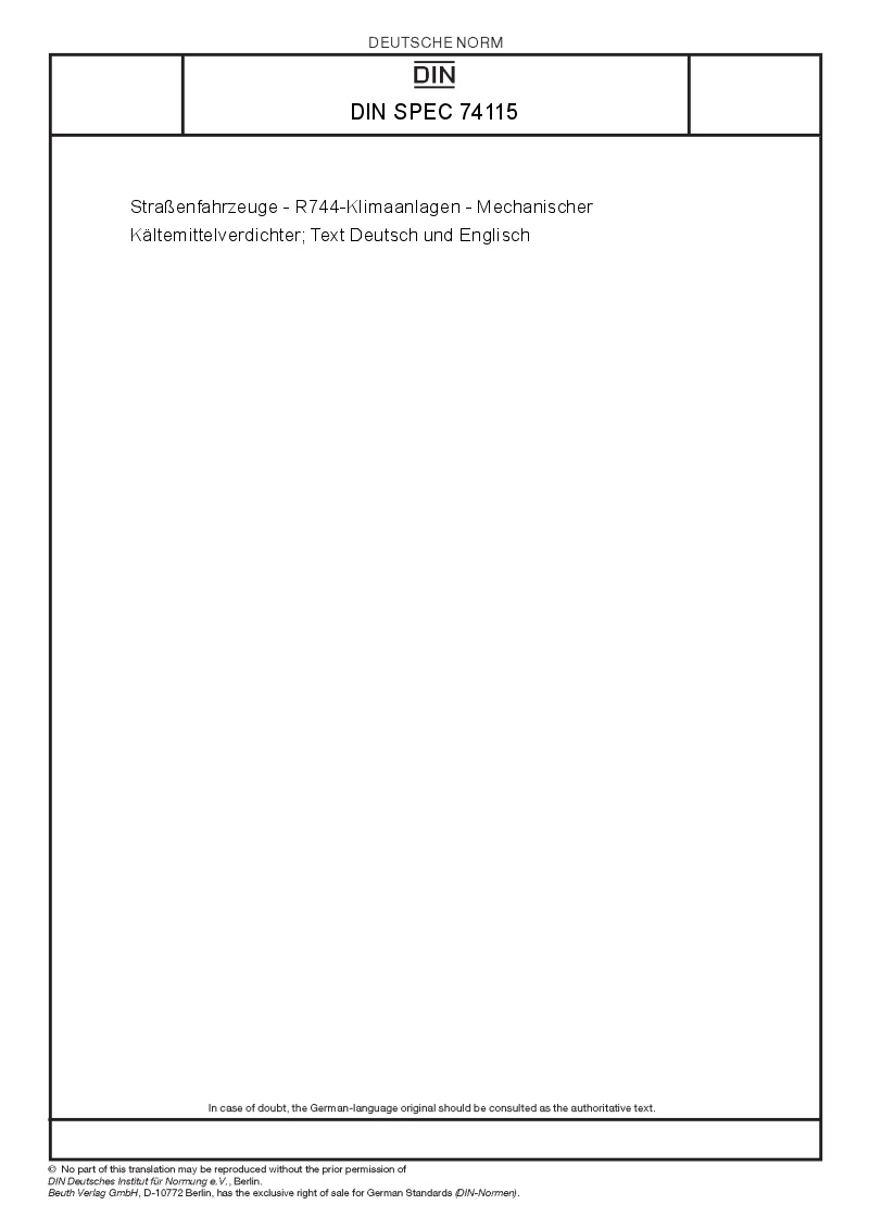 DIN SPEC 74115 Straßenfahrzeuge - R744-Klimaanlagen - Mechanischer Kältemittelverdichter; Text Deutsch und EnglischNot available online - contact us!