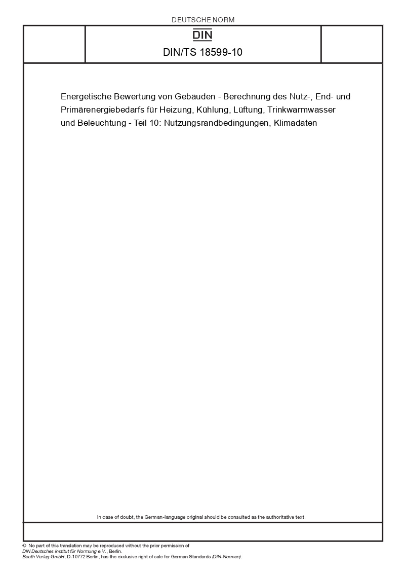 >DIN Standards>DIN/TS 18599-10 Energetische Bewertung von Gebäuden - Berechnung des Nutz-, End- und Primärenergiebedarfs für Heizung, Kühlung, Lüftung, Trinkwarmwasser und Beleuchtung - Teil 10: Nutzungsrandbedingungen, Klimadaten