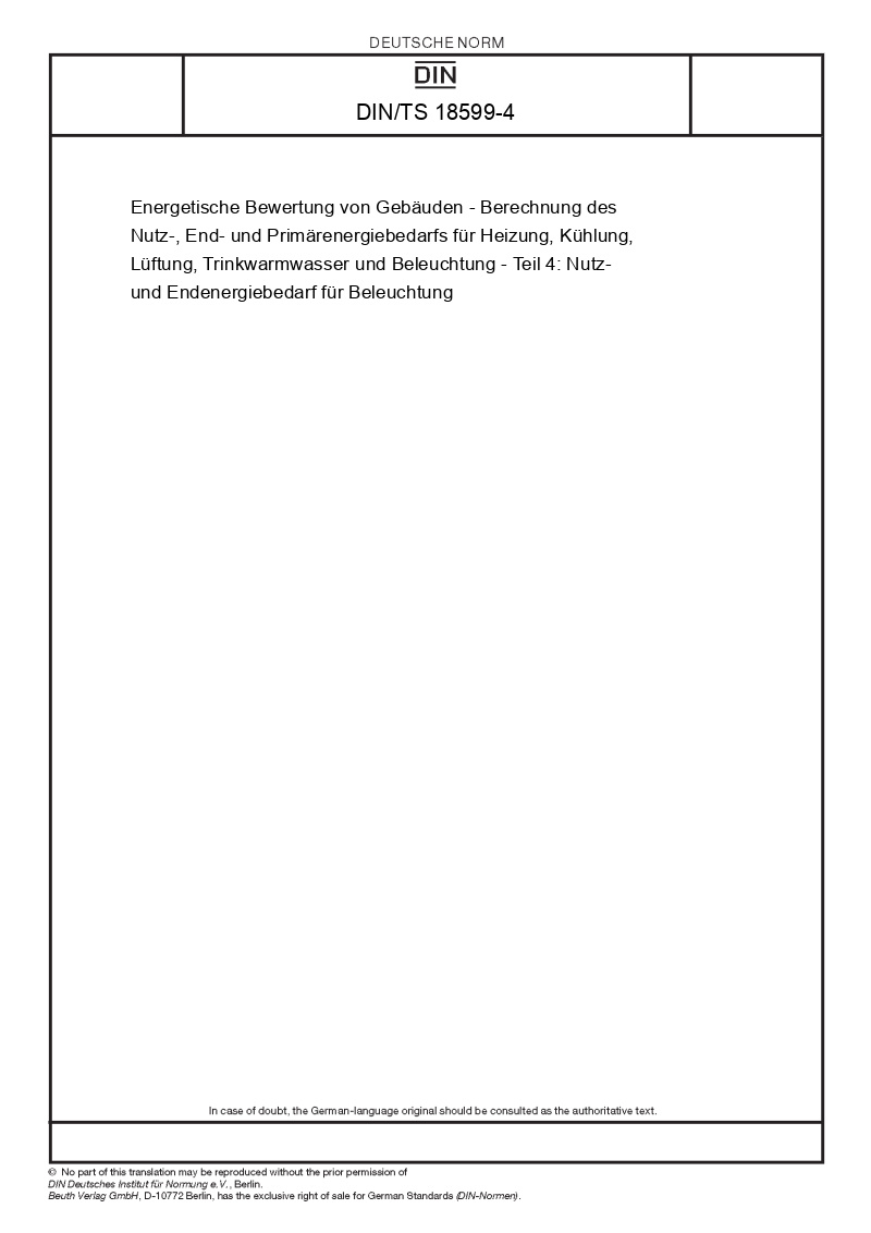 >DIN Standards>DIN/TS 18599-4 Energetische Bewertung von Gebäuden - Berechnung des Nutz-, End- und Primärenergiebedarfs für Heizung, Kühlung, Lüftung, Trinkwarmwasser und Beleuchtung - Teil 4: Nutz- und Endenergiebedarf für Beleuchtung