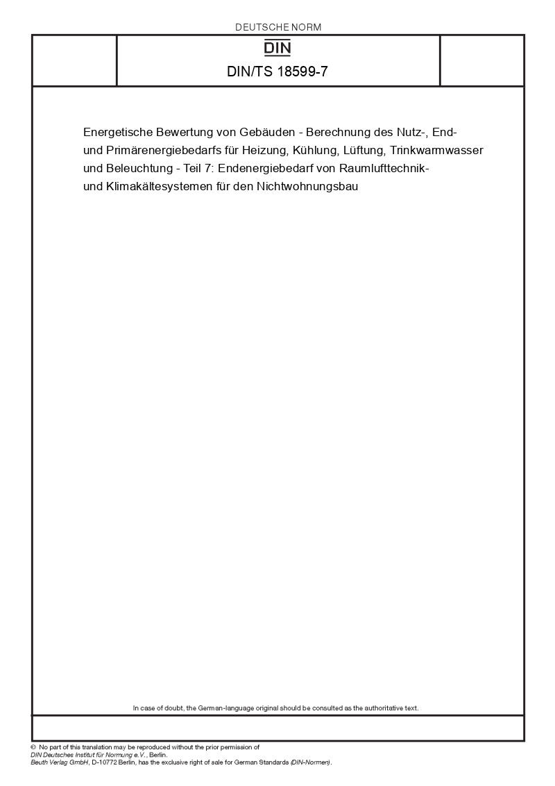 Name: | Energetische Bewertung von Gebäuden - Berechnung des Nutz-, End- und Primärenergiebedarfs für Heizung, Kühlung, Lüftung, Trinkwarmwasser und Beleuchtung - Teil 7: Endenergiebedarf von Raumlufttechnik- und Klimakältesystemen für den Nichtwohnungsbau |