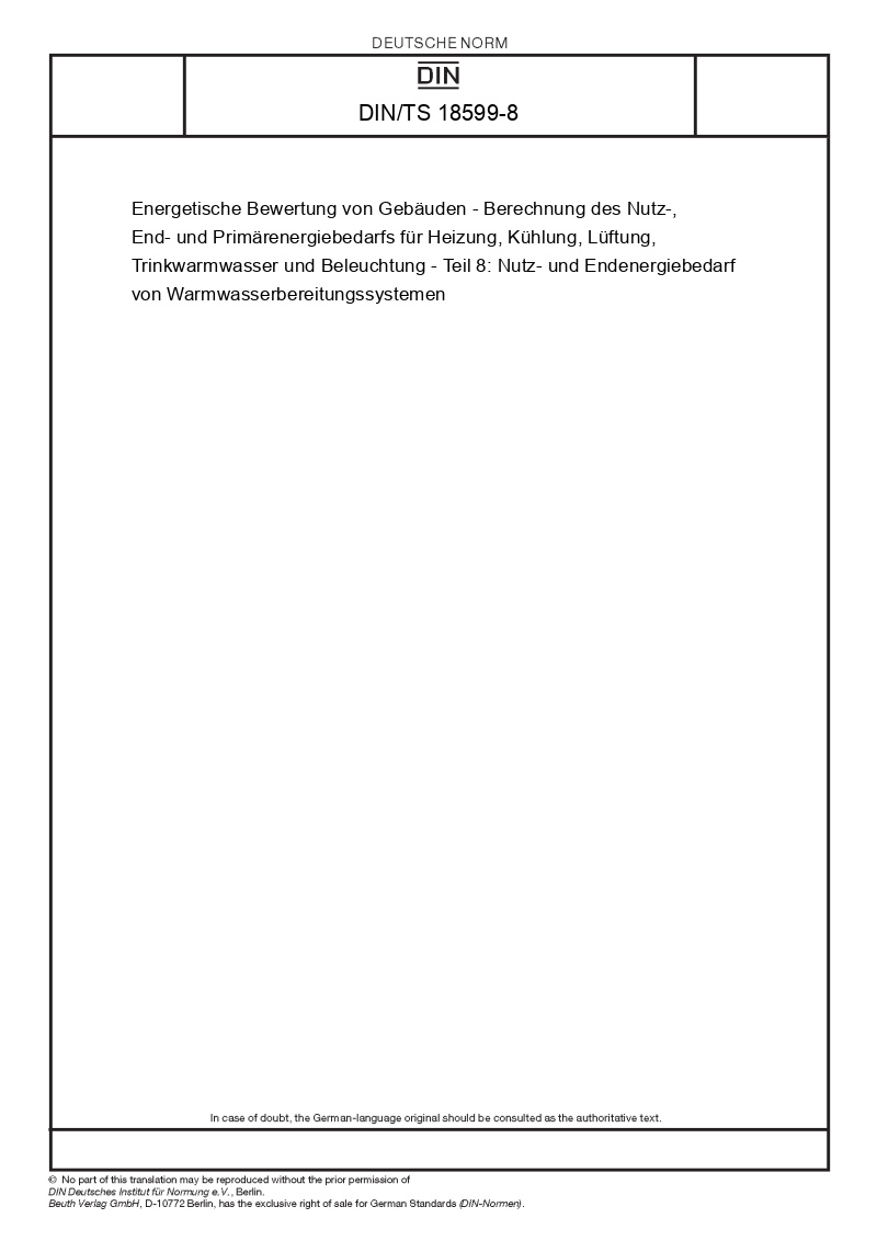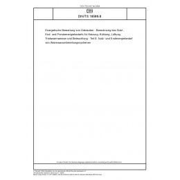 Name: | Energetische Bewertung von Gebäuden - Berechnung des Nutz-, End- und Primärenergiebedarfs für Heizung, Kühlung, Lüftung, Trinkwarmwasser und Beleuchtung - Teil 8: Nutz- und Endenergiebedarf von Warmwasserbereitungssystemen |