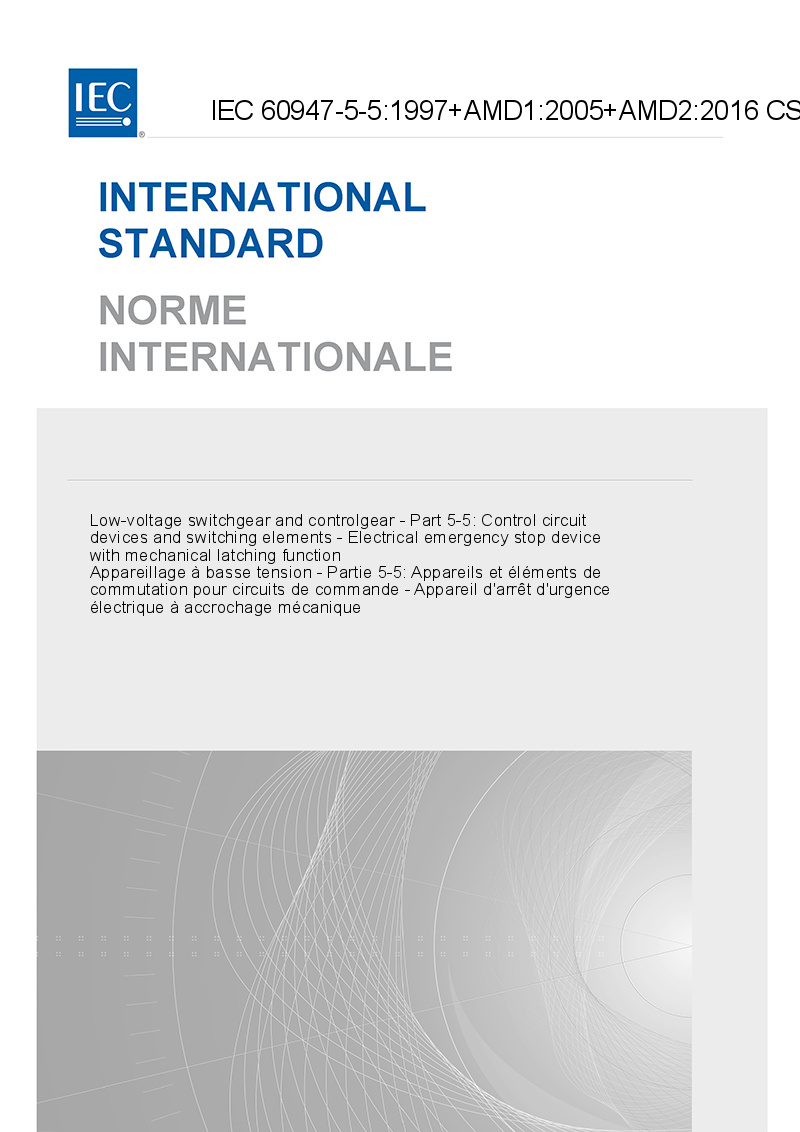 IEC 60947-5-5:1997+A1:2005+A2:2016 Is applicable to electrical control circuit devices and switching elements which are used to provide an emergency stop signal. Such devices may be either provided with their own enclosure, or installed according to the manufacturer's instructions. This consolidated version consists of the first edition (1997), its amendment 1 (2005) and its amendment 2 (2016). Therefore, no need to order amendments in addition to this publication.