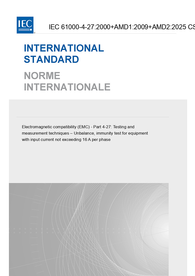 IEC 61000-4-27:2000+A1:2009+A2:2025 considers immunity tests for electric and/or electronic equipment (apparatus and system) in its electromagnetic environment. Only conducted phenomena are considered, including immunity tests for equipment connected to public and industrial networks. Establishes a reference for evaluating the immunity of electrical and electronic equipment when subjected to unbalanced power supply voltage. Applies to 50 Hz/60 Hz three-phase powered electrical and/or electronic equipment with rated line current up to 16 A per phase. This consolidated version consists of the first edition (2000) and its amendment 1 (2009). Therefore, no need to order amendment in addition to this publication.