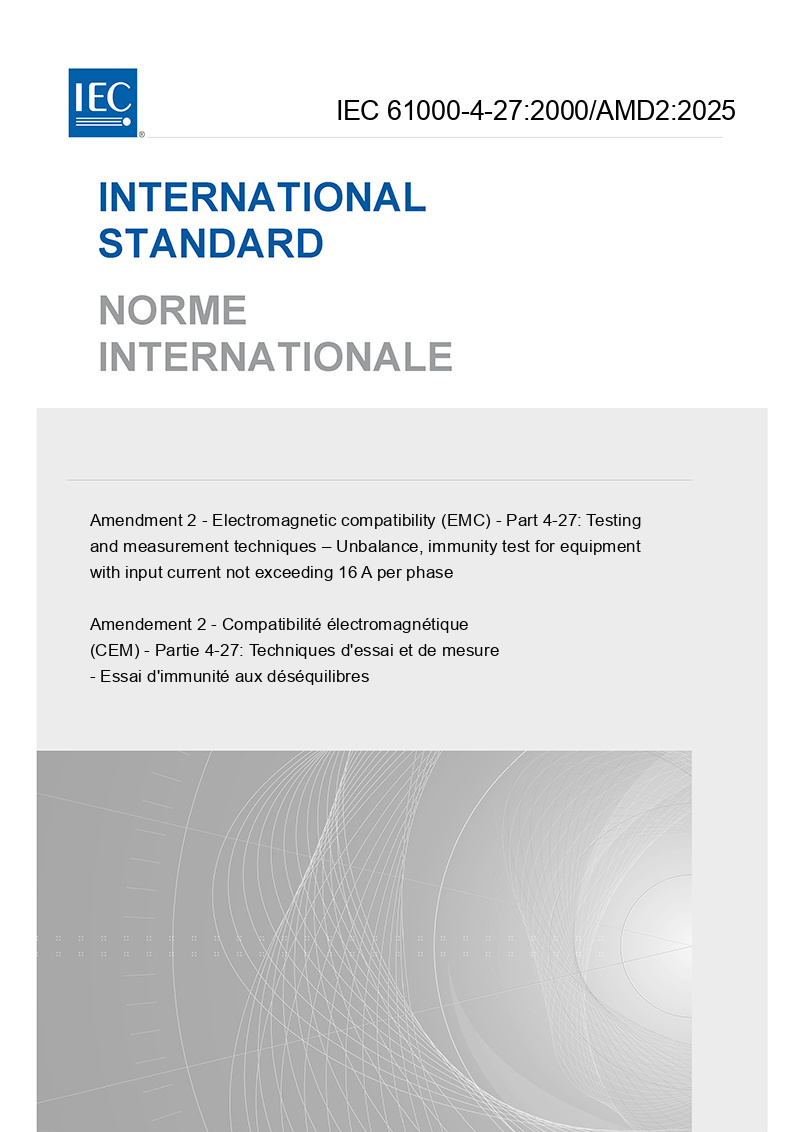 >IEC Standards>IEC 61000-4-27:2000/AMD2:2025 - Amendment 2 - Electromagnetic compatibility (EMC) - Part 4-27: Testing and measurement techniques – Unbalance, immunity test for equipment with input current not exceeding 16 A per phase