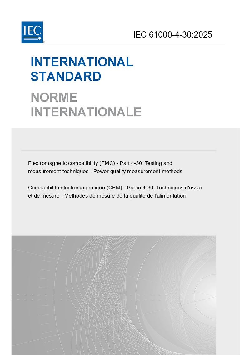 IEC 61000-4-30:2025 defines the methods for measurement and interpretation of results for power quality parameters in AC power supply systems with a declared fundamental frequency of 50 Hz or 60 Hz. Measurement methods are described for each relevant parameter in terms that give reliable and repeatable results, regardless of the method’s implementation. This document addresses measurement methods for in-situ measurements. This document covers two classes of measurement methods (Class A and Class S). The classes of measurement are specified in Clause 4.