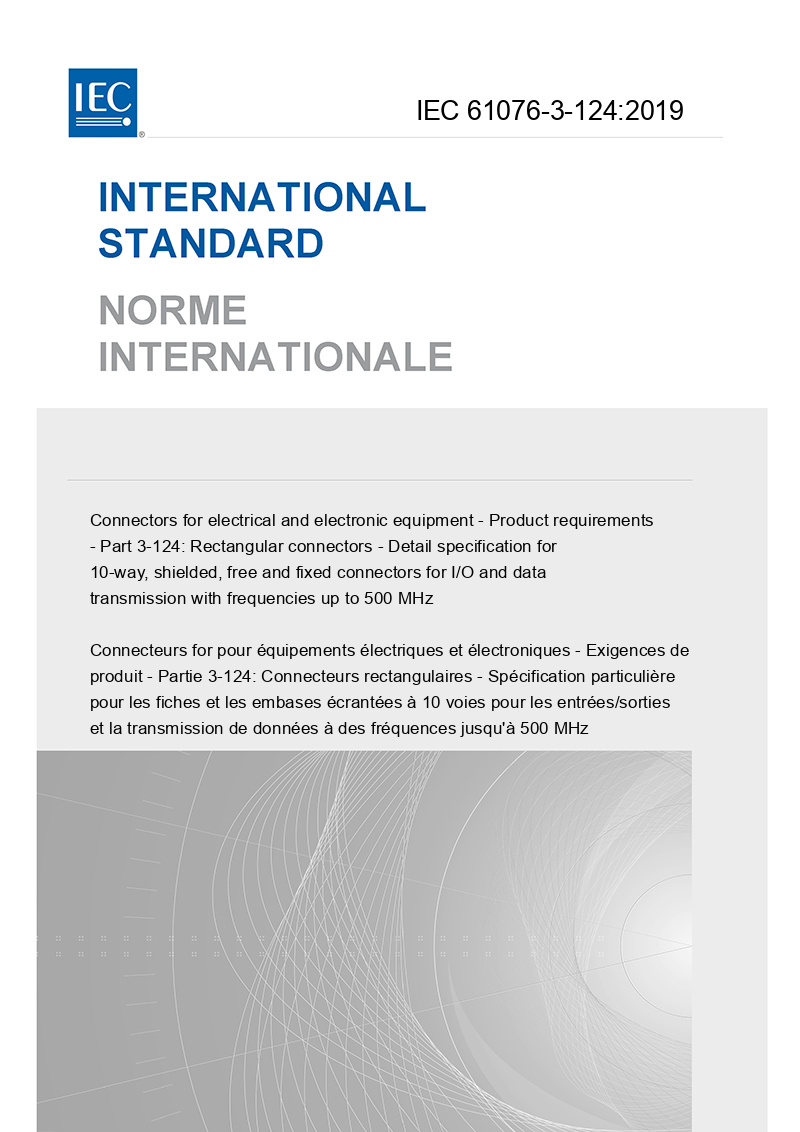 IEC 61076-3-124:2019 covers 10-way, shielded, free and fixed rectangular connectors for data transmission with frequencies up to 500 MHz and specifies the common dimensions, mechanical, electrical and transmission characteristics and environmental requirements as well as test specifications respectively.