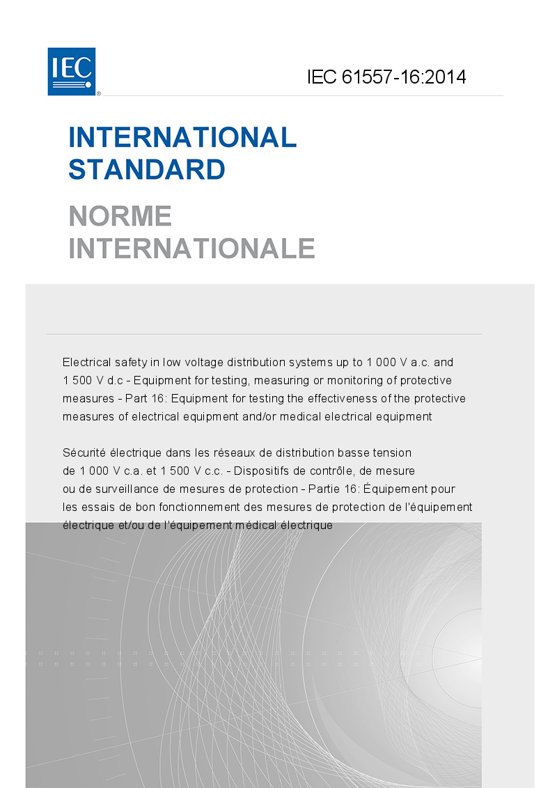 IEC 61557-16:2014 defines performance requirements for test and measurement equipment to determine the effectiveness of the protective measures of electrical measures for electrical equipment and/or medical electrical equipment described in IEC 62353. It is the intention of this standard to achieve comparable measuring results, additional safety for the testing person and negligible electrical stress for the unit under test. Keywords: leakage current, patient applied part This publication is to be read in conjunction with IEC 61557-1:2007.