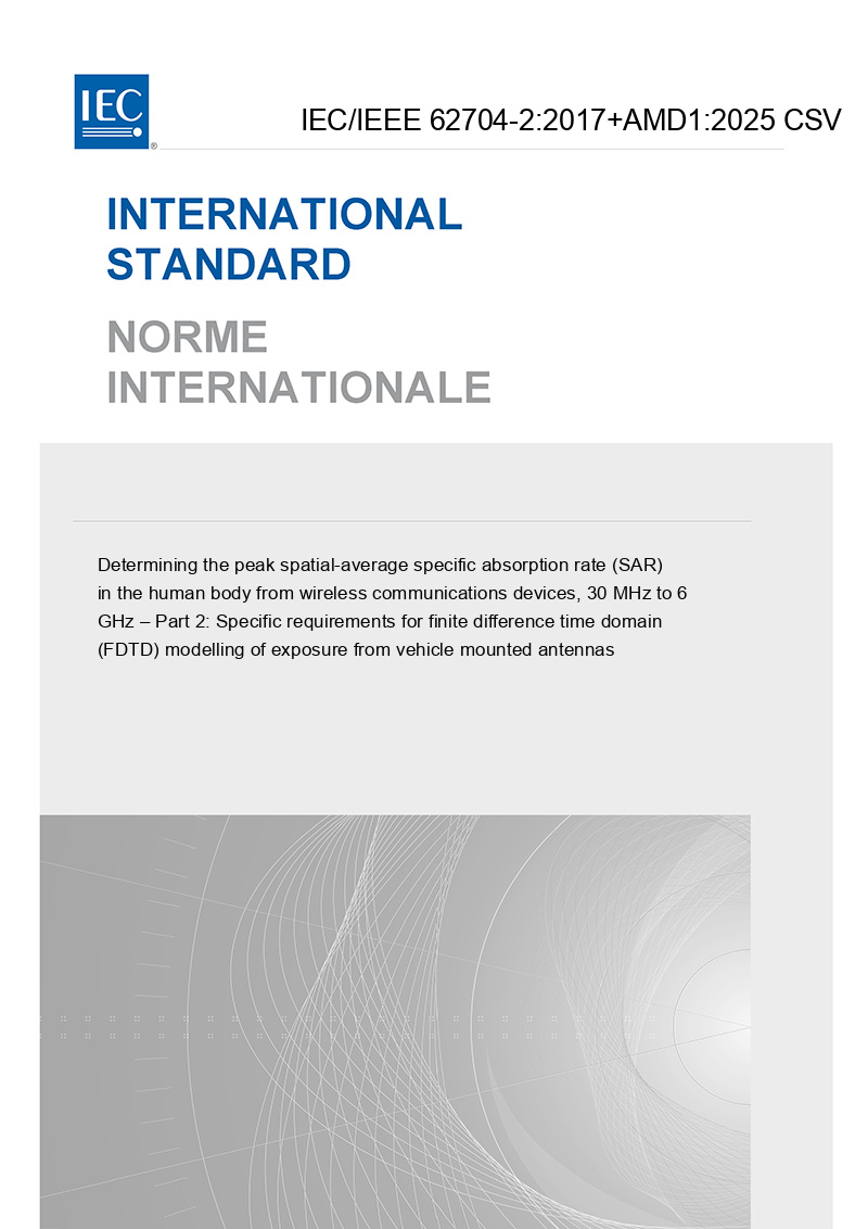 IEC/IEEE 62704-2:2017+A1:2025 establishes the concepts, techniques, validation procedures, uncertainties and limitations of the finite difference time domain technique (FDTD) when used for determining the peak spatial-average and whole-body average specific absorption rate (SAR) in a standardized human anatomical model exposed to the electromagnetic field emitted by vehicle mounted antennas in the frequency range from 30 MHz to 1 GHz, which covers typical high power mobile radio products and applications. This document specifies and provides the test vehicle, human body models and the general benchmark data for those models. It defines antenna locations, operating configurations, exposure conditions, and positions that are typical of persons exposed to the fields generated by vehicle mounted antennas. The extended frequency range up to 6 GHz will be considered in future revisions of this document. This document does not recommend specific peak spatial-average and whole-body average SAR limits since these are found in other documents, e.g. IEEE C95.1-2005, ICNIRP (1998).