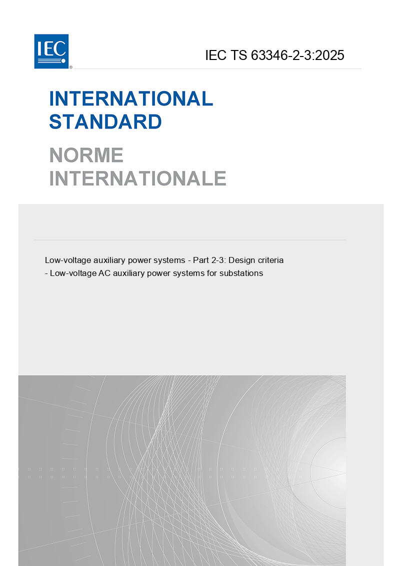 IEC TS 63346-2-3:2025 specifies common rules and requirements for the design of low voltage (LV) AC auxiliary power systems (APSs) intended to be installed in substations, mainly covering the configuration of AC power sources, system wiring, protection, electric equipment selection and physical layout.