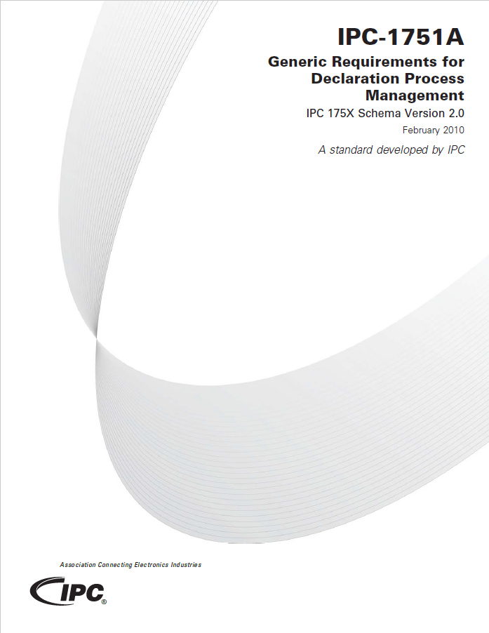 The 175x family of supplier declaration standards include: manufacturing process declaration (IPC-1751), materials declaration (IPC-1752), printed board declaration (IPC-1753), conflict minerals declaration (IPC-1755) assembly technology declaration (IPC-1756), and declaration of shipping, packing and packaging materials (IPC-1758).