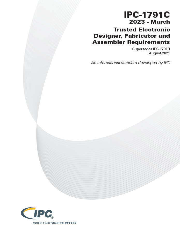 IPC-1791C provides minimum requirements, policies and procedures for printed board design, fabrication, assembly, and cable and wire harness assembly organizations and/or companies to become trusted sources for markets requiring high levels of confidence in the integrity of delivered products. These trusted sources shall ensure quality, supply chain risk management (SCRM), security and chain of custody (ChoC). IPC-1791C includes updates to perimeter security, repeat orders, management of sample materials.