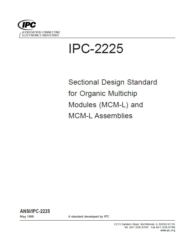 Used in conjunction with IPC-2221A, IPC-2225 establishes the requirements and other considerations (thermal, electrical, electromechanical and mechanical) for the design of Single Chip Module (SCM-L), MCM or MCM-L assemblies. Key concepts include adhesive interconnection information, typical die attach materials, microvia material properties and relationships with DFM and DFE. 44 pages. Released May 1998.