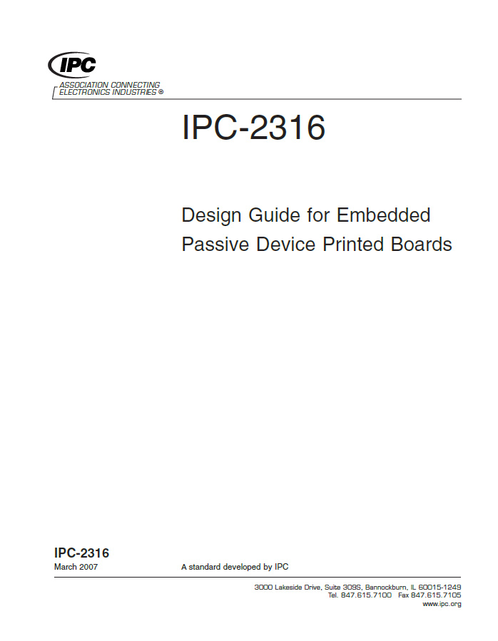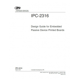 IPC-2316 offers printed board users and designers the necessary information for incorporating formed and placed embedded passive components into their applications. The history of embedded passive technologies is given along with full coverage of embedded resistors, capacitors and inductors. In addition, it also assists the user in understanding some of the physical, electrical and thermal characteristics of the embedded component materials so that their designs can achieve maximum stability and performance. 52 pages. Released March 2007.