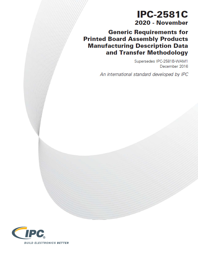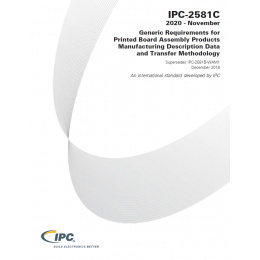 The IPC-2581C standard specifies the XML schema that represents the intelligent data file format used to describe printed board and printed board assembly products with details sufficient for tooling, manufacturing, assembly, and inspection requirements.