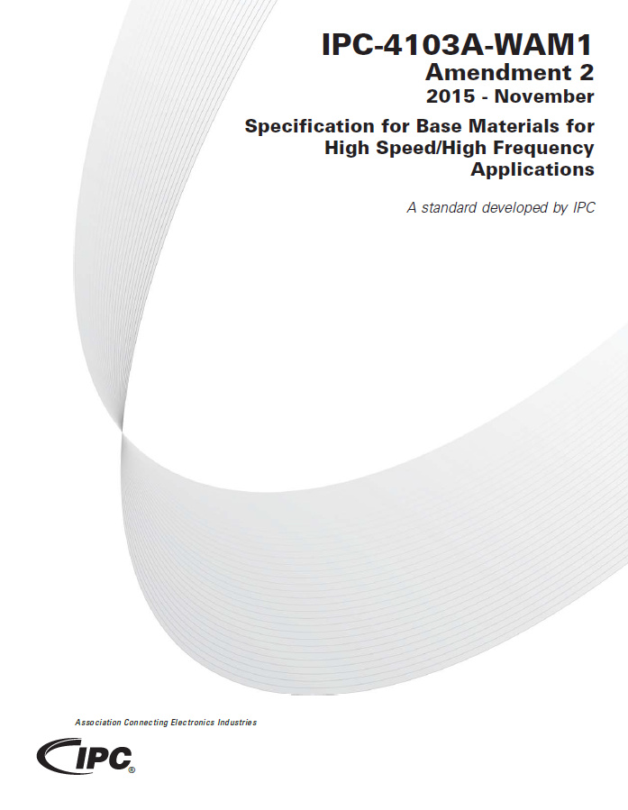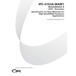 The Amendment 2 to IPC-4103A-WAM1 made four fundamental changes to the base standard: All references to the epoxy curative of DICY (dicyandiamide) were removed; Opaque foreign inclusions were more specifically defined and limited; The optional properties of thermal conductivity for both laminates and bonding layers were added; and The dielectric constant (permittivity) ranges were specifically delineated for both laminates and bonding layers. 5 pages. Released 2015.