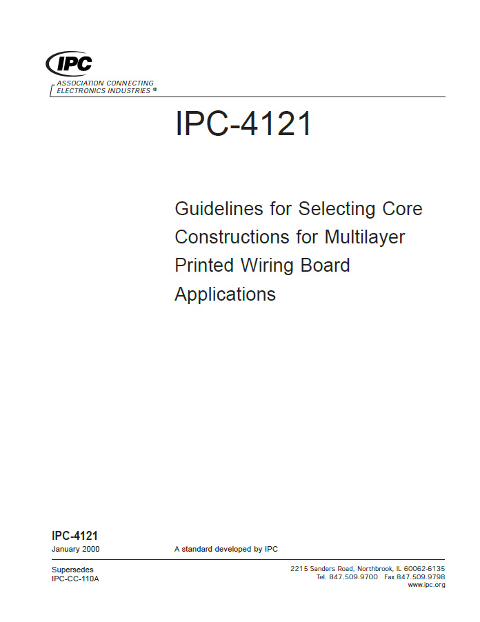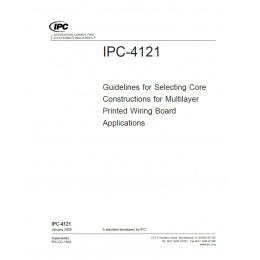 IPC-4121 provides industry-approved guidelines for selecting core constructions for multilayer printed wiring boards (PWBs). The specification sheets in the document categorize the different core constructions by laminate type and nominal thickness. The constructions are rated for characteristics such as dielectric constant (DK), dimensional stability (DS), flatness, smoothness and drillability. This document is a "must have" for those responsible for purchasing laminate materials for their company.
