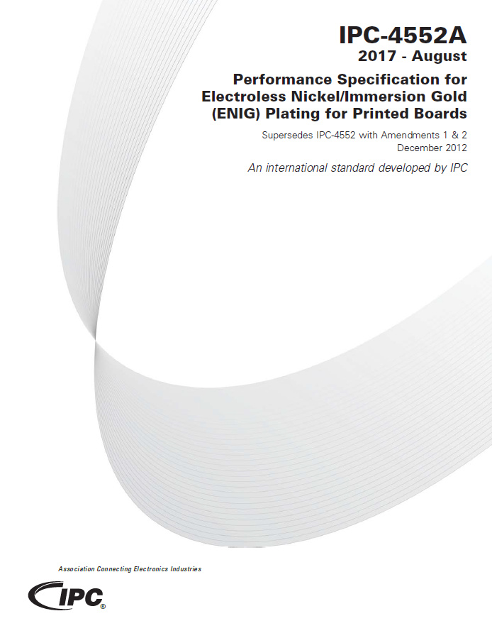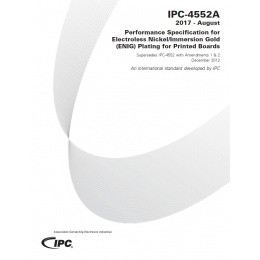The IPC-4552A performance specification sets requirements for Electroless Nickel/Immersion Gold (ENIG) deposit thicknesses for applications including soldering, wire bonding and as a contact finish. The IPC-4552A is intended for use by chemical suppliers, printed board manufacturers, electronics manufacturing services (EMS) and original equipment manufacturers (OEM). The IPC-4552A standard may be used to specify acceptance criteria to meet performance requirements in addition to those found in the IPC-6010-FAM Printed Board Performance Specifications. The ENIG deposit specified by using this document will meet the highest coating durability rating as specified in the J-STD-003 printed board solderability specification.