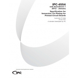 IPC-4554, Specification for Immersion Tin Plating for Printed Circuit Boards, is included in the IPC-455X series of specifications that set the requirements for printed board surface finishes that are alternates to non-coplanar finishes, most often referred to as tin-lead HASL finish. This specification is a full-color document that is intended for use by the supplier or printed board fabricator, plating chemistry supplier, contract assembler or EMS facility and the original equipment manufacturer (OEM). The immersion tin (Sn) is a metallic finish deposited by a chemical displacement reaction that is applied directly to the basis metal of the printed board, which is copper. The immersion tin is primarily used as a solderable surface for attachment of components. It may also be used when press fit connections are employed and for zero insertion force (ZIF) edge connectors. The immersion tin finish protects the underlying copper from oxidation over the intended shelf life of this finish that is described in IPC/EIA J-STD-003 as a Category 3 coating durability finish (storage of greater than six months). The inserted Amendment 1 provides more detail on the solderability of the immersion tin, using both tin-lead as well as "lead-free" solders using appropriate fluxes. 48 pages. Released with Amendment 1: January 2012.