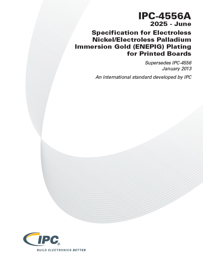 IPC-4556A Standard sets the requirements for the use of Electroless Nickel/Electroless Palladium/ Immersion Gold (ENEPIG) as a surface finish for printed boards. IPC-4556A standard defines ENEPIG deposit thicknesses for applications including soldering, wire bonding, and as a contact finish.