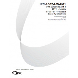 IPC-4562A-WAM1 covers metal foils supported by carrier films and unsupported foils suitable for subsequent use in printed boards. The Amendment 1 that has been inserted into the base document added back the light cold rolled-wrought copper foil (/6 [Cu-W6] that was previously removed during the revision A actions. Unless otherwise agreed upon between the user and supplier (AABUS), metal foils shall be considered acceptable, so long as the requirements in this specification are met.31 pages. Released January 2016.