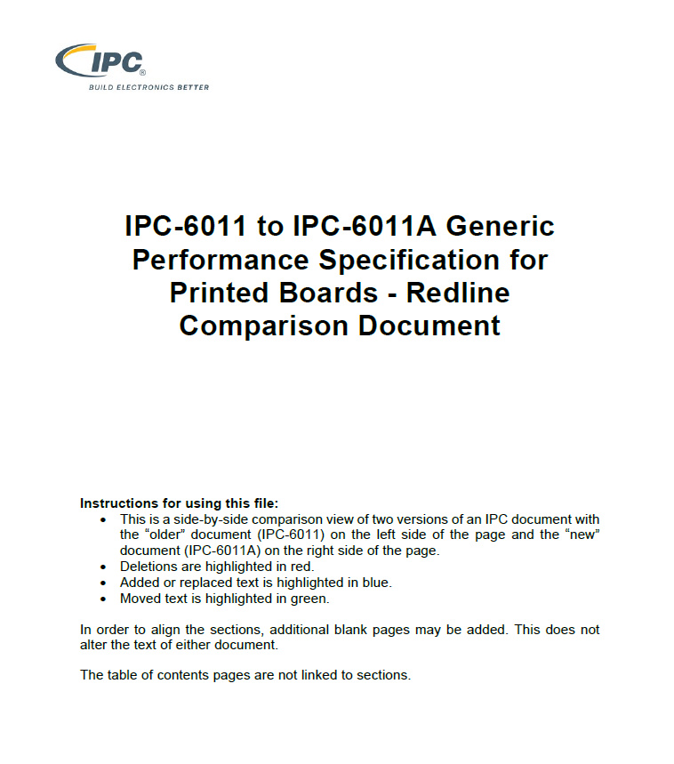 IPC-6011A Redline document shows the changes from IPC-6011 to IPC-6011A in a side-by-side comparison of the two documents. The IPC-6011A Redline is available in electronic format only.