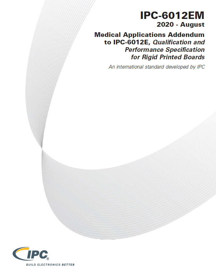 The IPC-6012EM Addendum, when required by procurement documentation/drawings, supplements or replaces specifically identified requirements of IPC-6012E, for rigid printed boards that must meet requirements to high reliability medical device applications. IPC-6012EM is the only global industry-consensus standard for Medical Applications to Qualification and Performance Specifications for Rigid Printed Boards.