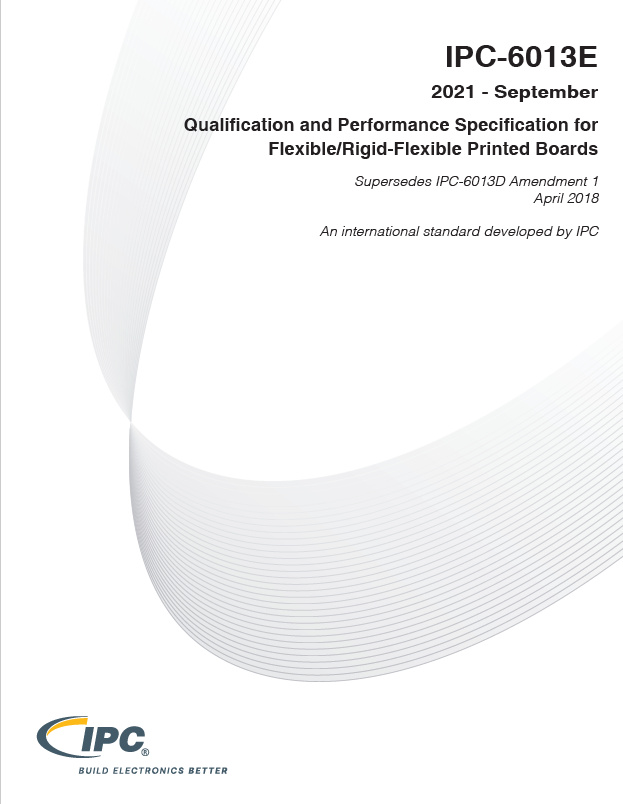 IPC-6013E standard covers qualification and performance requirements for flexible printed boards designed to IPC-2221 and IPC-2223. The flexible printed board may be single-sided, double-sided, multilayer or rigid-flex multilayer. All of these constructions may include stiffeners, PTHs, microvias, and blind/buried vias. The IPC-6013E standard incorporates new and updated requirements for final finishes, rigid-to-flex transition zones, foreign inclusions, surface mount land anomalies, plated internal layers, dielectric removal as a function of wicking and etchback, copper filled via structures microvia structures.