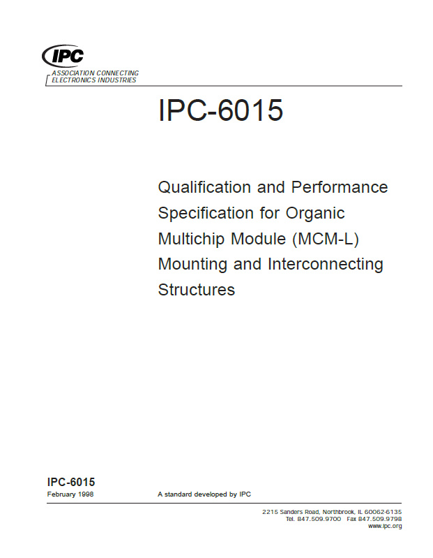 Establishes the specific requirements for organic mounting structures used to interconnect chip components, which in combination form the completed functional organic single-chip module (SCM-L) or organic multichip module (MCM-L) assembly. Includes the quality and reliability assurance requirements that must be met for their acquisition. For use with IPC-6011. 25 pages. Released February 1998.