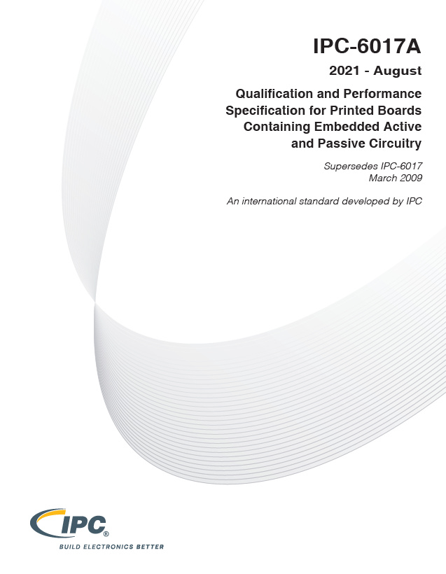 The IPC-6017A standard defines the electrical, mechanical, and environmental requirements specific to embedded passive and active circuitry in printed boards. These requirements are in addition to the applicable requirements of other performance specification(s) (e.g., J-STD-001).
