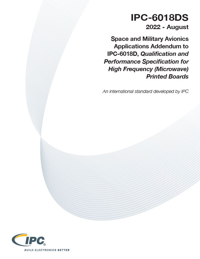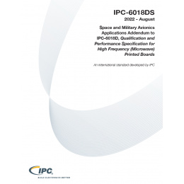 The IPC-6018DS addendum supplements or replaces specifically identified requirements of IPC-6018D, for high frequency (microwave) printed boards that must survive the vibration, ground testing and thermal cyclic environments of space and military avionics. The IPC-6018DS addendum incorporates new requirements in areas such as copper wrap plating, dewetting, pad/land anomalies, copper cap plating of filled holes, copper filled microvias and therma shock. For use with IPC-6011 and IPC-6018. Supersedes IPC-6018CS.