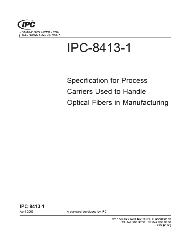 The purpose of this specification is to define standard practices for handling various kinds of optical fiber and to define the specifications and guidelines to be used in the design of carriers for these fibers in component manufacturing. This document is identified in the overarching IPC-0040, Optoelectronic Assembly and Packaging Technology. This standard does not define a particular carrier design, but does define enough parameters to facilitate the use of fiber carriers in optoelectronic component manufacturing, particularly in automated or semi-automated processes. 15 pages. Released April 2003.