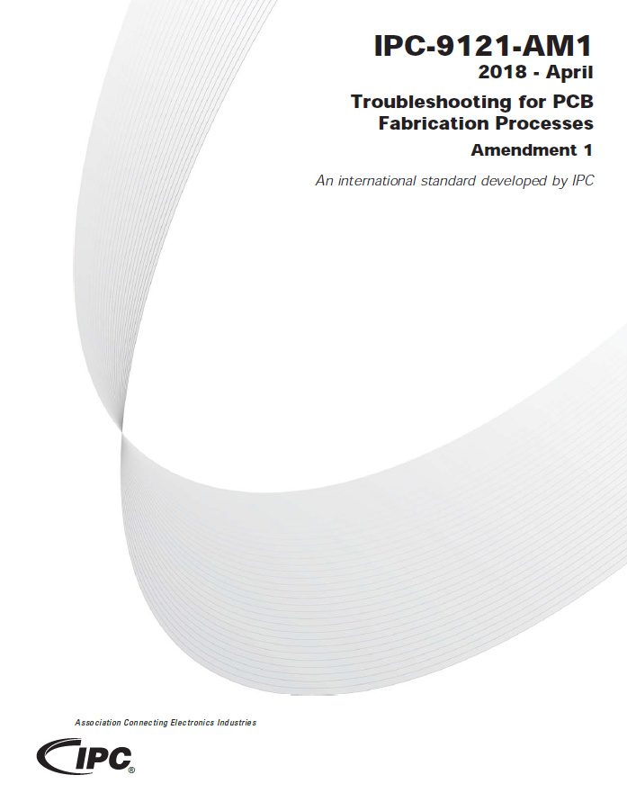 IPC-9121 AM1 is an amendment to IPC-9121 which provides updates to the Hole Preparation/Protection and Interconnect Formation sections, covering troubleshooting topics and guidance on nonconductive plugging paste, microvias and pattern plating rim voids. IPC-9121 AM1 also includes a new section on Flexible Circuits.