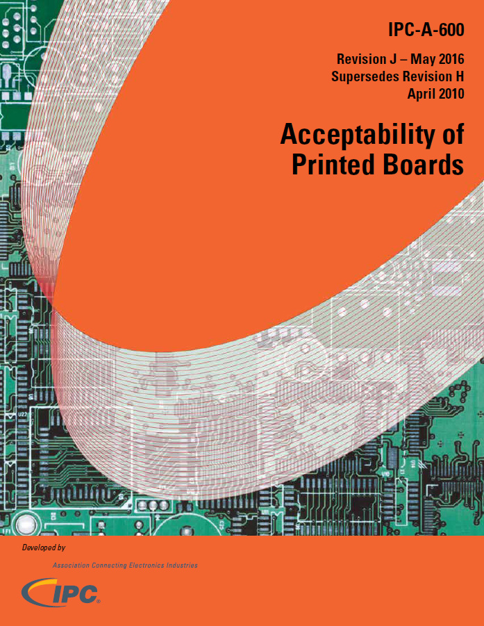 The definitive illustrated guide to printed board acceptability! This four-color document provides photographs and illustrations of the target, acceptable and nonconforming conditions that are either internally or externally observable on bare printed boards. Make sure your operators, inspectors, and engineers have the most current industry consensus information. With 120 new or revised photographs and illustrations, revision J provides new coverage on topics such as microvia contact dimensions, plating, voiding and fill, along with updated and expanded coverage for dielectric removal (etchback, smear and wicking), plating folds, surface plating for edge connectors, SMT and BGA pads, marking, hole registration, delamination, cap plating, via fill and flexible circuits. The document synchronizes to the acceptability requirements expressed in IPC-6012D and IPC-6013C. Supersedes IPC-A-600H.
