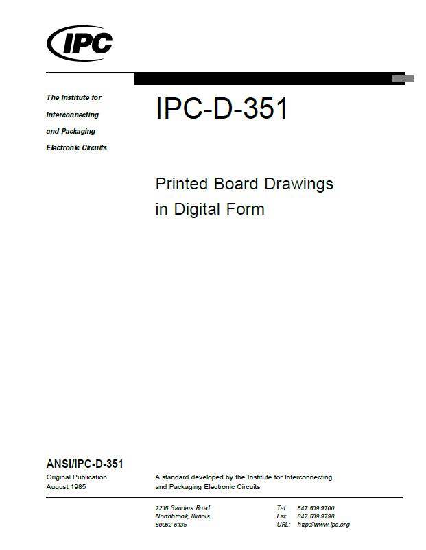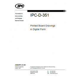 Describes an intelligent, digital format for transfer of drawings between printed wiring board designers, manufacturers and customers. Also conveys additional requirements, guidelines and examples necessary to provide the data structures and concepts for drawing description in digital form. Supplements ANSI/IPC-D-350. Pertains to four basic types of drawings: master drawings, schematics, assembly drawings and miscellaneous part drawings. This document is frozen; no future updates are planned. 52 pages. Released August 1985.