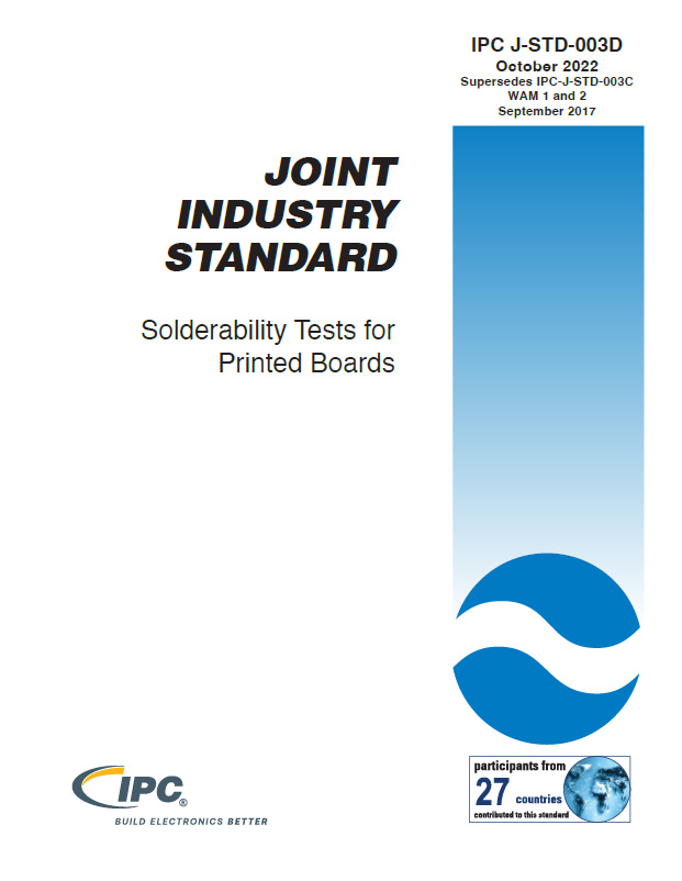 The IPC J-STD-003D standard describes solderability determinations that are made to verify that the printed board fabrication processes and subsequent storage have had no adverse effect on the solderability of those portions of the printed board intended to be soldered. Solderability is determined by evaluation of a test specimen which has been processed as part of a panel of boards and subsequently removed for testing per the method selected. IPC J-STD-003D provides solderability test methods to determine the acceptance of printed board surface conductors, attachment lands, and plated-through holes to wet easily with solder, and to withstand the rigors of the printed board assembly processes.