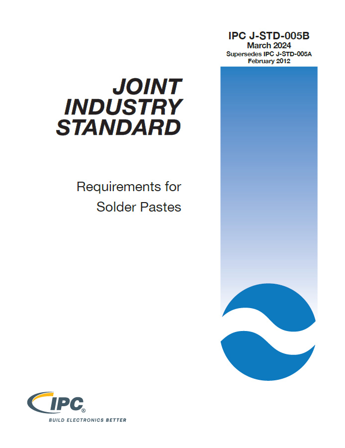 IPC J-STD-005B standard lists the requirements for qualification and characterization of solder paste. It references test methods, criteria, and metal content, viscosity, slump, solder ball, tack and wetting of solder pastes. Additional support is provided in IPC-HDBK-005, Guide to Solder Paste Assessment.