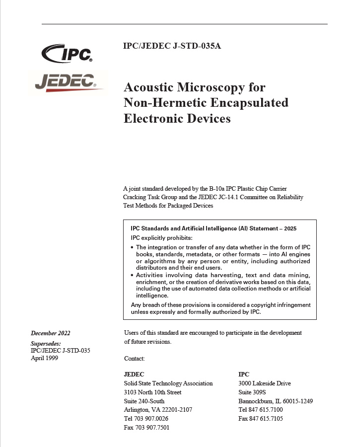 IPC/JEDEC J-STD-035A test method defines the procedures for performing acoustic microscopy on nonhermetic encapsulated electronic devices. IPC/JEDEC J-STD-035A method provides users with an acoustic microscopy process flow for detecting anomalies (delaminations, cracks, mold compound voids, etc.) nondestructively in encapsulated electronic devices while achieving reproducibility