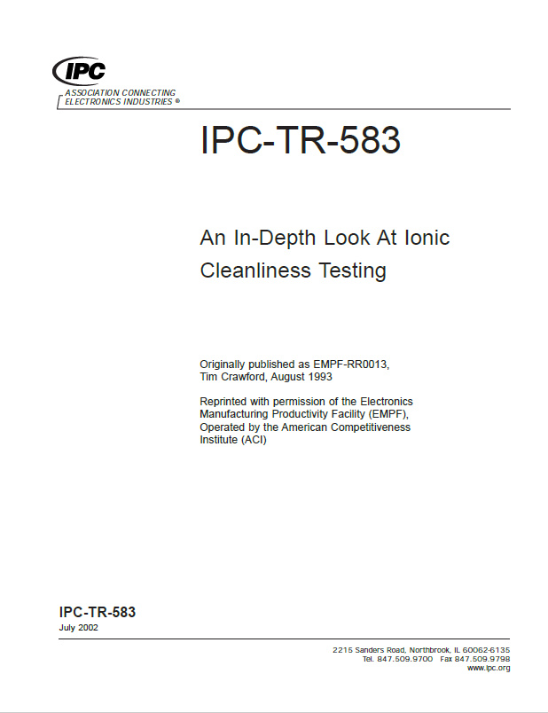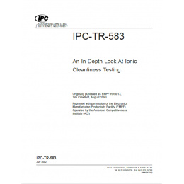 This original research was a cooperative effort between the EMPF and IPC, released as EMPF-RR-0013 in 1993 for better understanding of ionic cleanliness testing. The IPC Ionic Conductivity/Ion Chromatography Test Task Group has validated its continued importance and relevance to the cleaning community and IPC-TR-583 is the result. It includes how solvent temperature influences the final cleanliness results, criticality of a 75% isopropyl to 25% water ratio, value of spraying the solvent, etc. The report provides quantified results to help users determine what variables most influence ionic cleanliness test results. 231 Pages. Released July 2002.