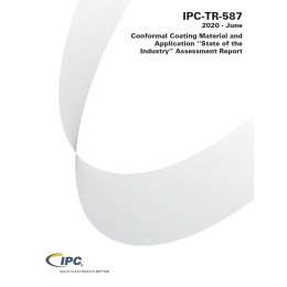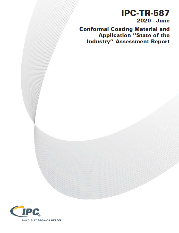 IPC-TR-587 is a report outlining an IPC study of major conformal coating types, coating application techniques, and coating cure technologies, characterizing the final film thickness on common component surfaces.