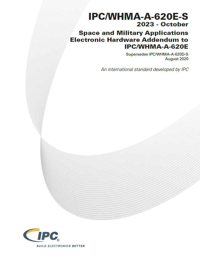 IPC/WHMA-A-620E-S space addendum provides additional requirements to IPC/WHMA-A-620E standard to ensure the reliability of cable and wire harness assemblies that must survive the vibration and thermal excursions encountered getting to and operating in the military and space environments. IPC/WHMA-A-620E-S cannot be used as a standalone document. It must be used with the base standard IPC/WHMA-A-620E.