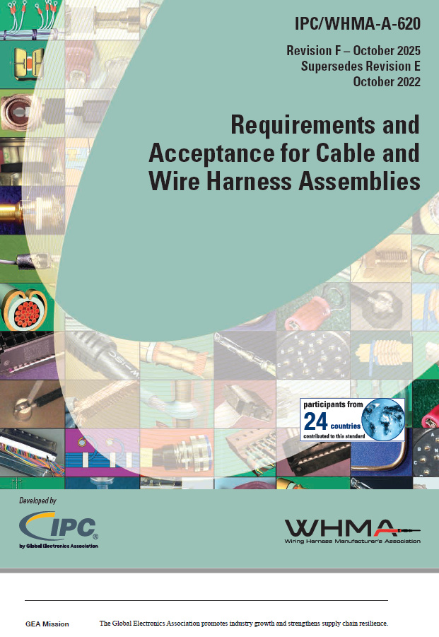 IPC/WHMA-A-620 is the only industry-consensus standard for Requirements and Acceptance of Cable and Wire Harness Assemblies. IPC/WHMA-A-620F describes materials, methods, tests and acceptance criteria for producing crimped, mechanically secured and soldered interconnections and the related assembly activities associated with cable and harness assemblies.