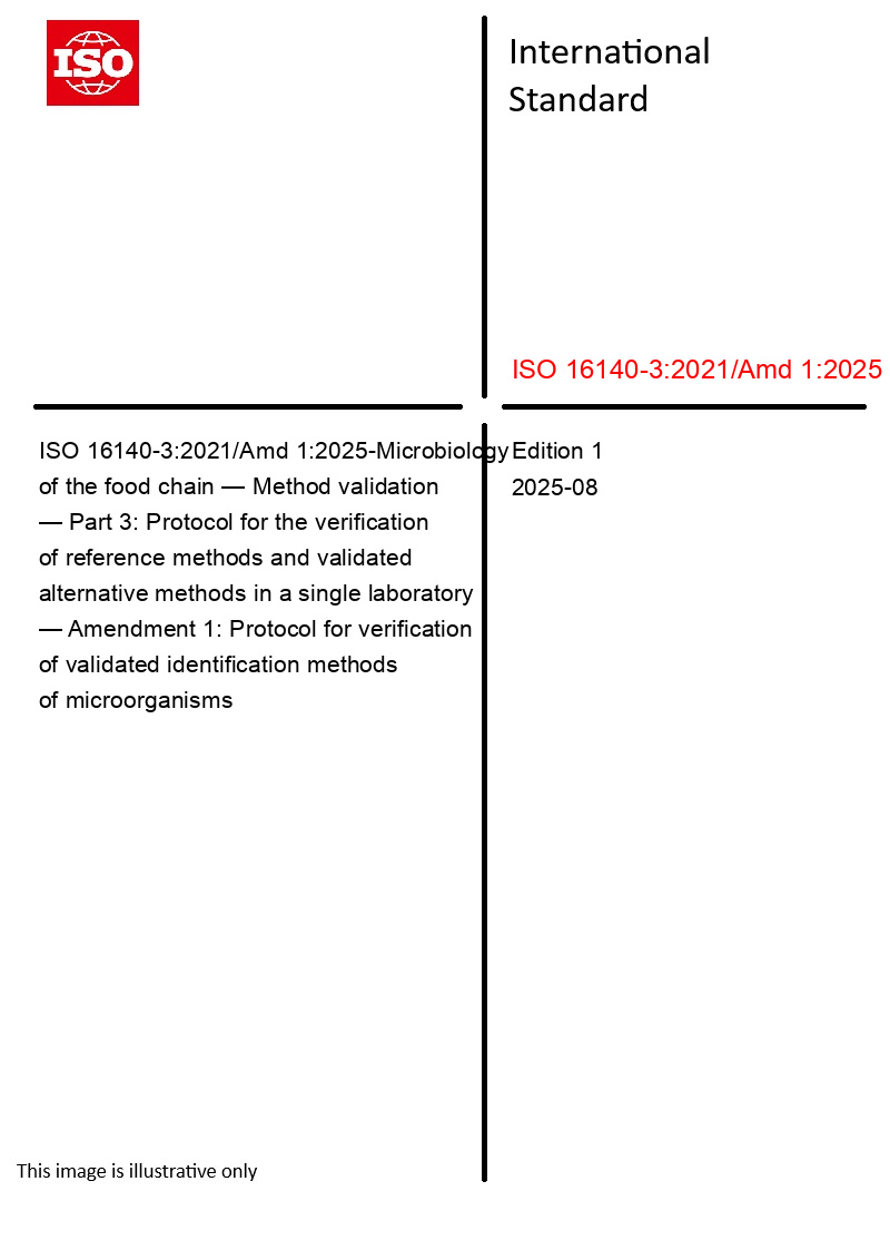ISO 16140-3:2021/Amd 1:2025-Microbiology of the food chain — Method validation — Part 3: Protocol for the verification of reference methods and validated alternative methods in a single laboratory — Amendment 1: Protocol for verification of validated identification methods of microorganisms