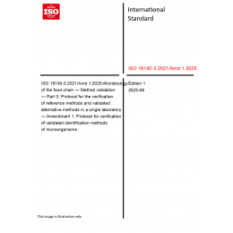 >ISO Standards>ISO 16140-3:2021/Amd 1:2025-Microbiology of the food chain — Method validation — Part 3: Protocol for the verification of reference methods and validated alternative methods in a single laboratory — Amendment 1: Protocol for verification of validated identification methods of microorganisms